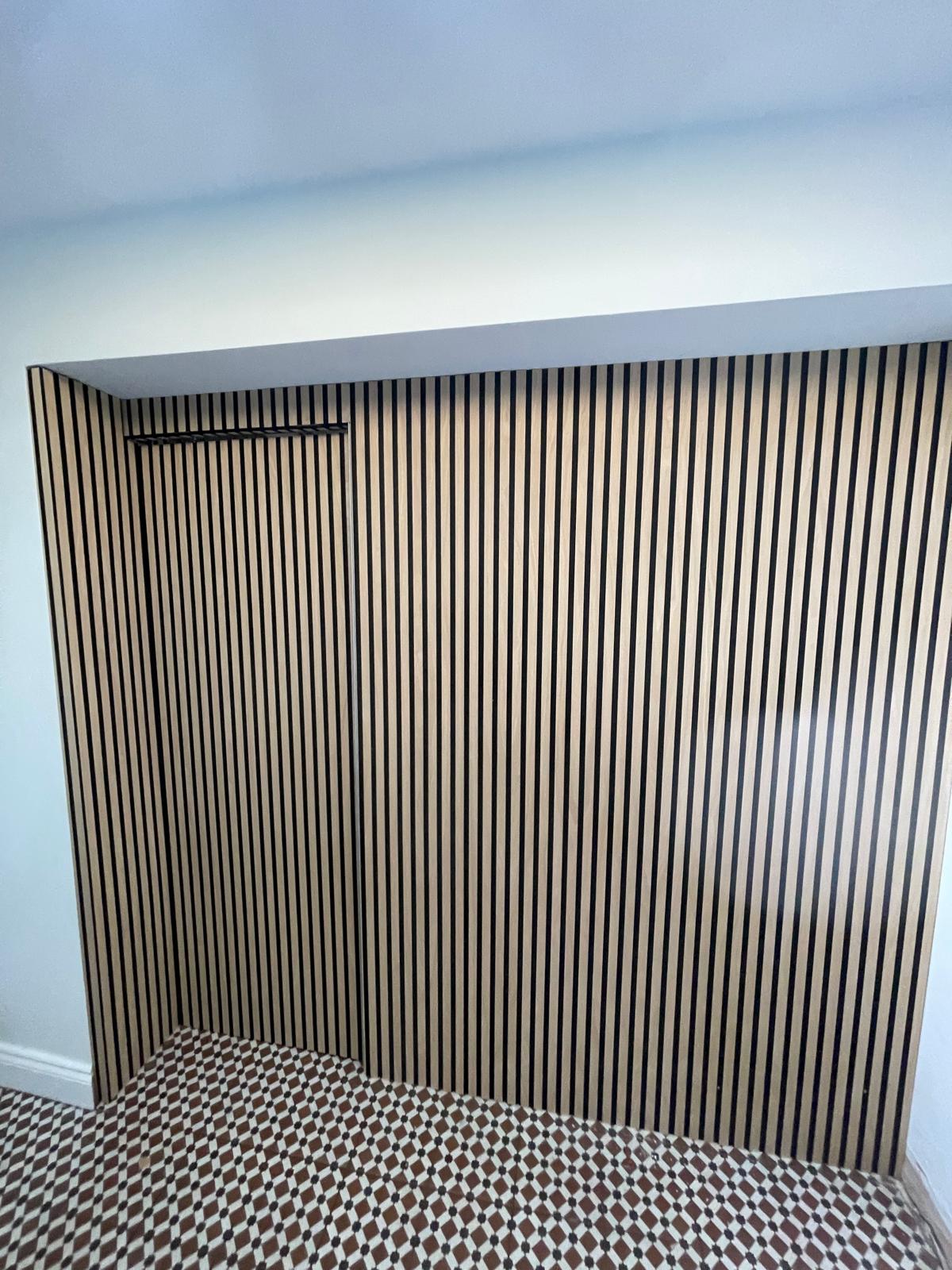 Media unit made to house the TV and electric fireplace, install of acoustic panelling. Removal of old flooring and[…]