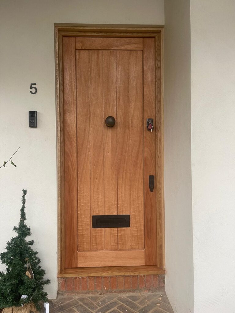 A beautifully installed hardwood door and frame, seamlessly fitted to incorporate the existing Banham locks for added security and a refined finish.